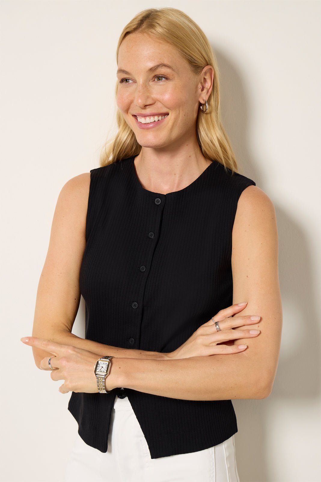 A chic staple for summer. the Bobbie vest top by EVEREVE is crafted from soft rib knit fabric and features a fitted. cropped silhouette with front button closures.