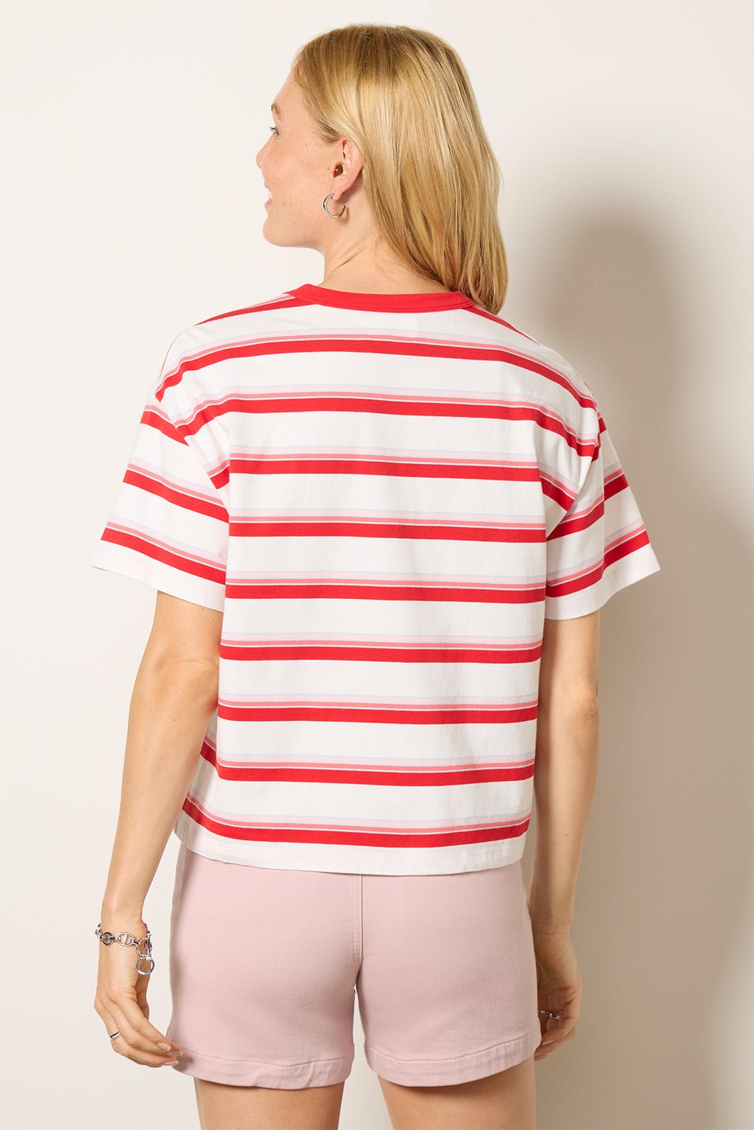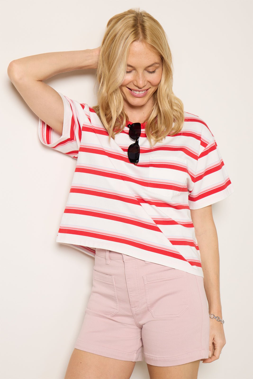 Vibrant stripes adorn this summer-ready tee by Xirena. finished in soft cotton fabric with a relaxed fit. left chest pocket. and short sleeves.
